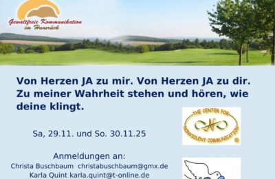 Immer wieder gibt es im Alltag Situationen, in denen ich mich grollend zurückziehe, weil ich gekränkt bin. Dann braucht es Mut, mich ernst zu nehmen, mir selbst treu zu bleiben und mich zunächst einmal zu klären. Danach kann ich versuchen zu verstehen, was er oder sie hinter der unglücklichen Aussage gemeint haben könnte und dadurch in eine neue Verbindung kommen. In diesem Seminar bieten wir Raum für Selbsteinfühlung, um dann mitfühlend mit unserem Gegenüber sein zu können. Die Grundlage ist die Gewaltfreie Kommunikation nach Dr. Marshall Rosenberg.