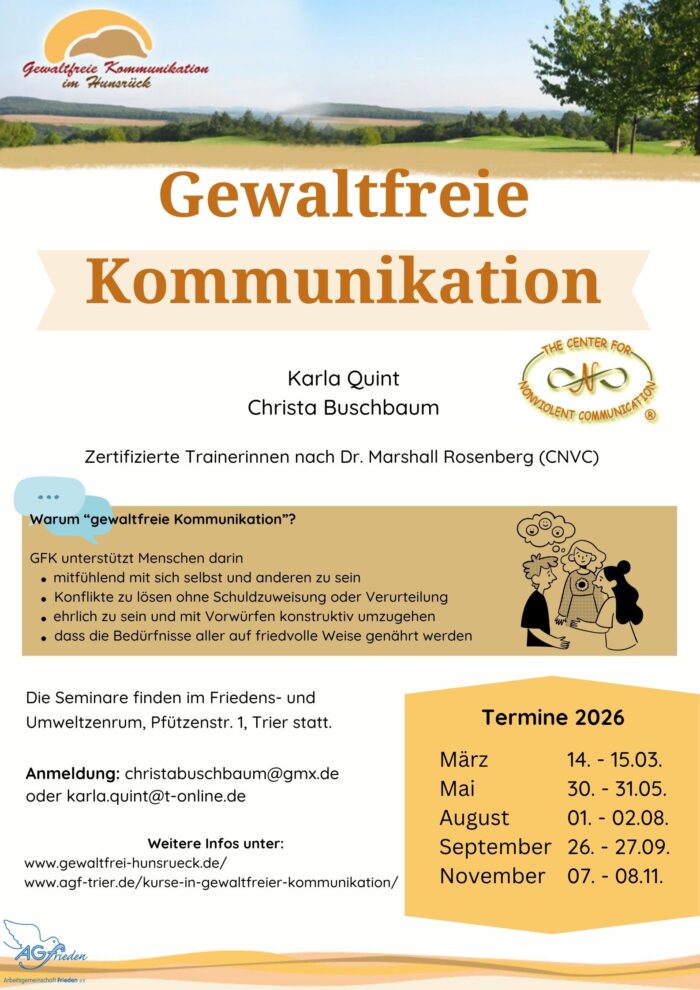Überall dort, wo Menschen zusammenkommen, geschieht Kommunikation, die mehr oder weniger befriedigend gelingt. Dr. Marshall Rosenberg entwickelte eine Kommunikationsmethode, die bereichernde Beziehungen aufbaut und erhält. GFK bereichert Beziehungen, unterstützt persönliche Entwicklung und trägt zum sozialen Wandel bei. Das passt gut zu den Anliegen der AGF und ihrem Einsatz für Frieden, Menchenrechte und Gerechtigkeit.
